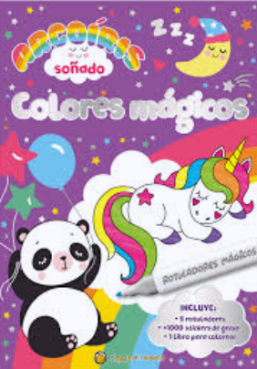 Una caja mágica que incluye 1 libro con 8 páginas gruesas para colorear, una plancha de stickers de gema súper brillantes y 5 rotuladores para colorear ¡como más te guste!